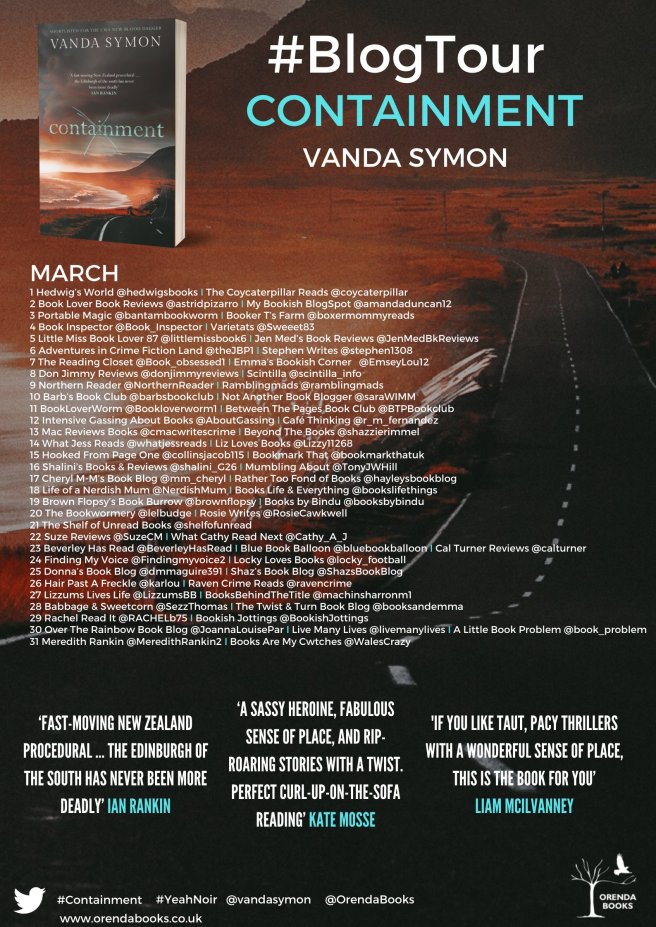 I am very excited to be part of this blog tour for Containment by Vanda Symon, and now to be sharing my thoughts. Thank you to Anne Cater for giving me the chance to participate, and to Orenda Books for providing me with a free copy.