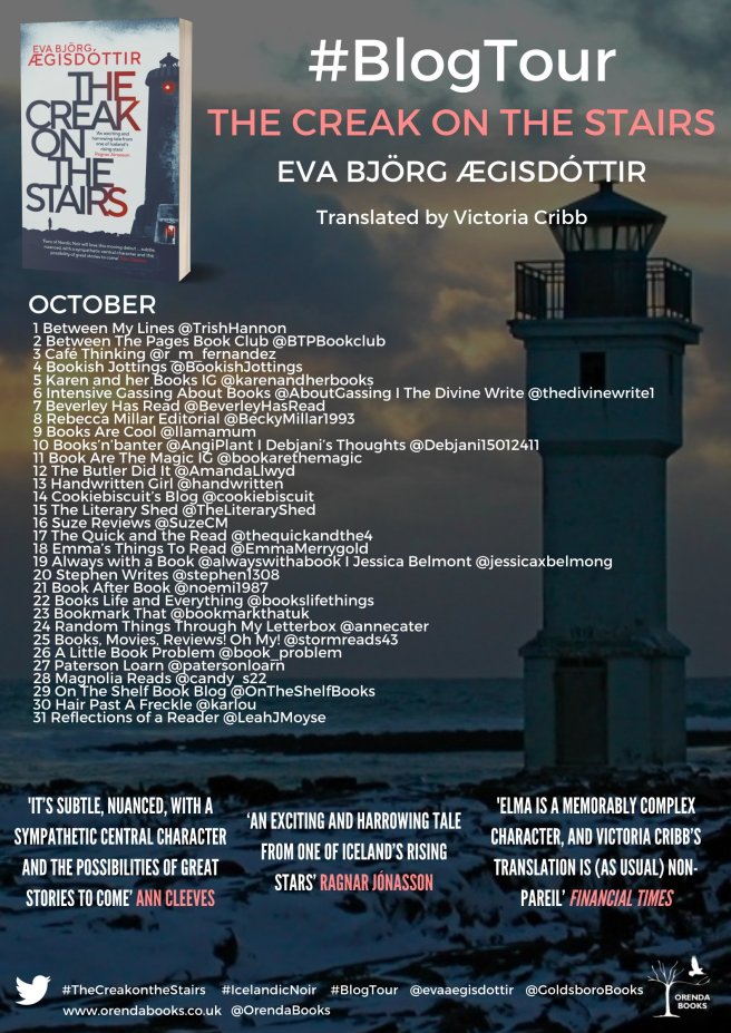 As mentioned in the review, Eva Björg Ægisdóttir was born in Akranes, the setting for this book. Originally published in 2018, The Creak On The Stairs is her debut novel and won the Blackbird Award, becoming a bestseller. It has since been picked up by Orenda Books. She lives in Reykjavik with her husband and three children.